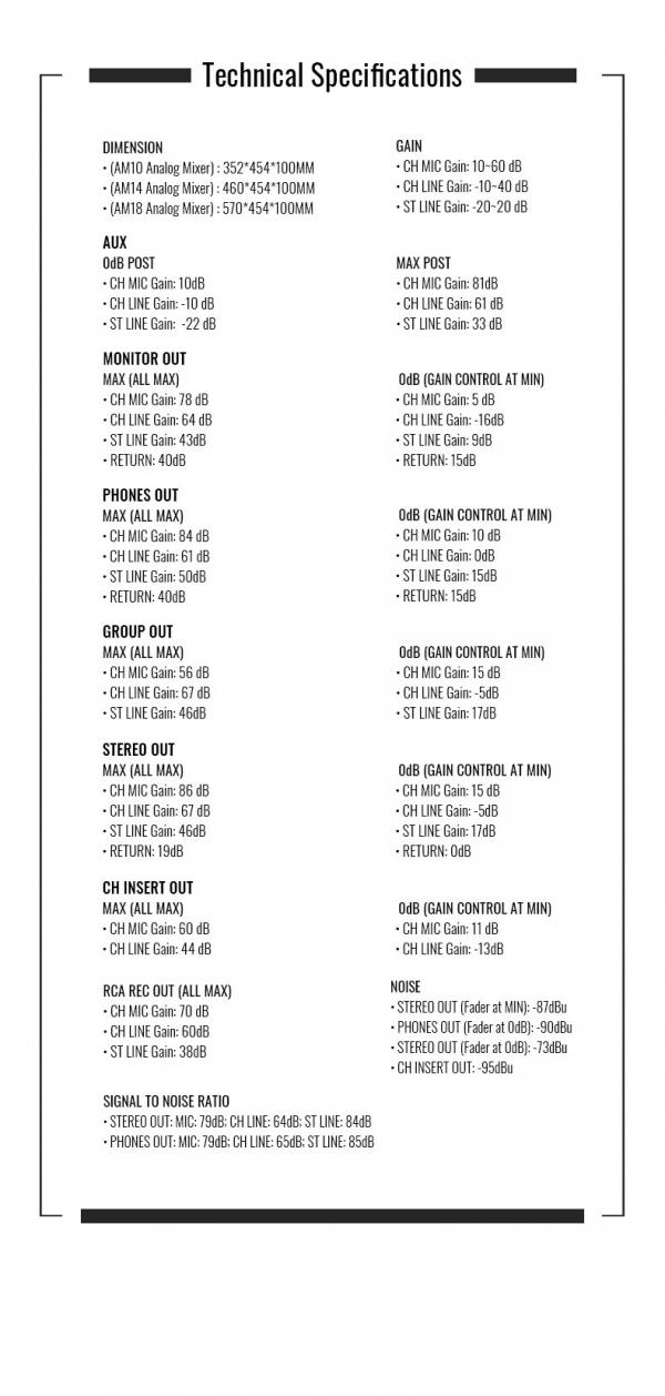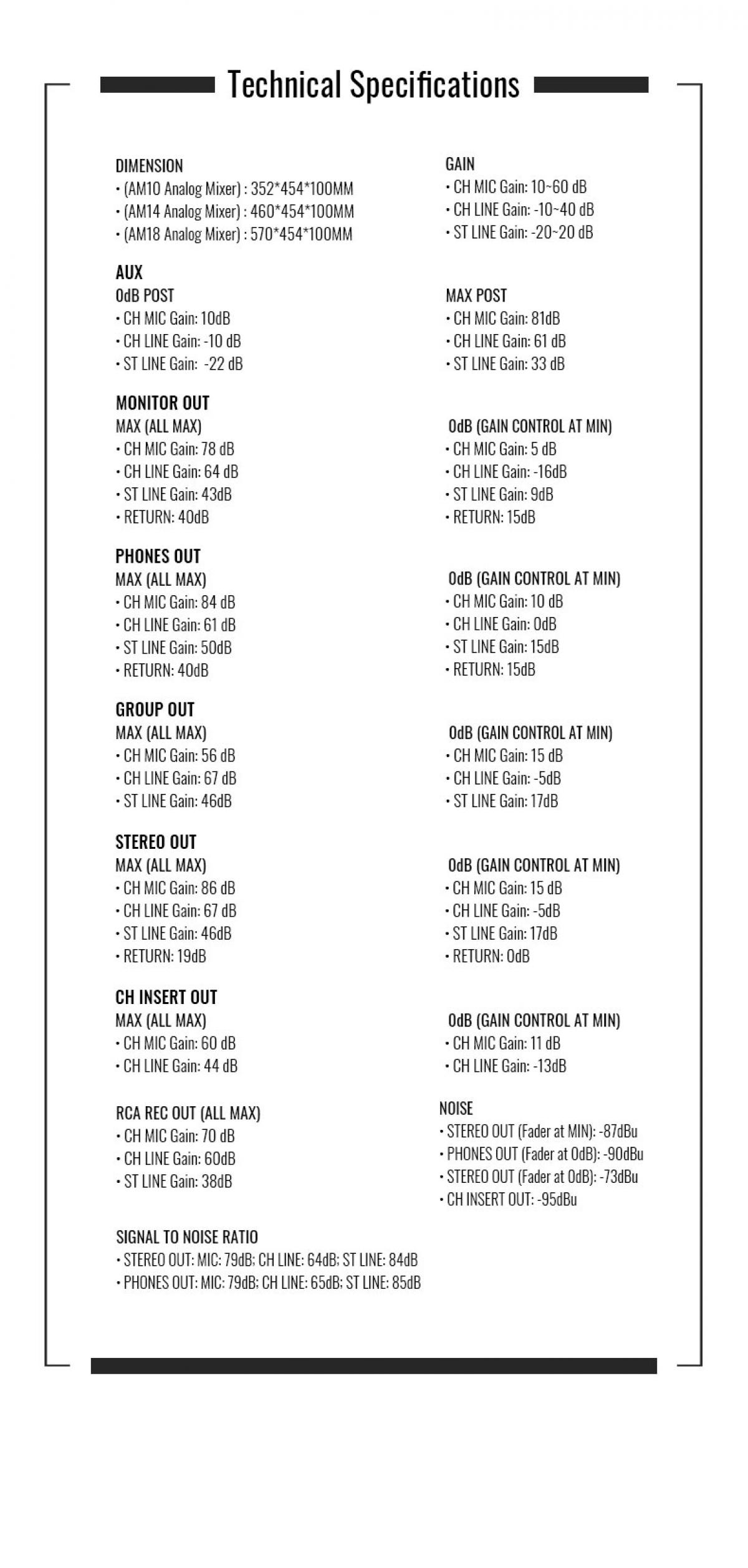 - MAIN OUT: MIC: 79 dB MONO LINE: 64 dB STEREO LINE: 84 dB